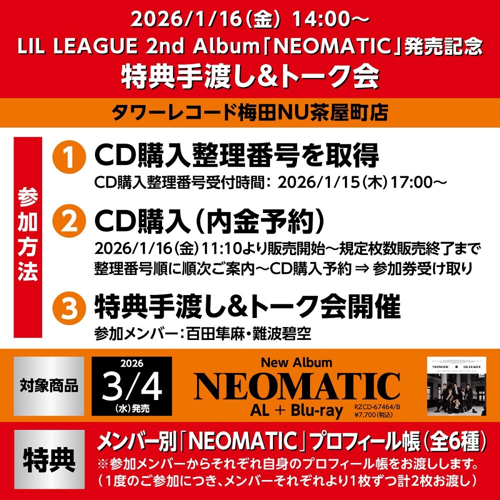 LIL LEAGUE 2ndアルバム「NEOMATIC」発売記念 特典手渡し&トーク会の開催が決定いたしました!